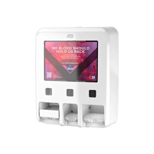 Ta vare på ansatte og besøkende. Med Tork-dispenseren tilpasset Libresse produkter, blir det enklere å tilby sanitetsprodukter på toalettene. Dispenseren har plass til både bind, tamponger og truseinnlegg, slik at det er enkelt å finne det rette produktet. - Dekker flere behov med ulike sanitetsprodukter i én dispenser - Låsbar dispenser - Praktisk, men slitesterkt design som passer perfekt inn på toalettrom - Mål (LxBxH): 32x12,1x39,4 cm. - Vekt: 1,9 kg - Materiale: plast.
