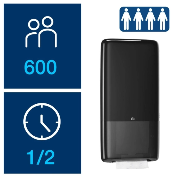 Tork PeakServe®, utformet for toalettrom med høy trafikk, der personalet må maksimere rengjøringstiden og opprettholde en god flyt for gjestene. Systemet, som er kompatibelt med Tork PeakServe® Continuous® håndtørk, har en svært stor kapasitet på over 2050 håndtørk, som kan utmates raskt og uten avbrudd for å opprettholde en god flyt. Håndtørk utmates på tre sekunder for en bedre flyt på toalettrommet, uten ventetid for gjestene. Komprimerte håndtørk betyr 250 % flere håndtørk, noe som forhindrer at det plutselig går tomt sammenlignet med Tork Universal refiller og Multifold håndtørk-dispensere. - Etterfyll håndtørk når det passer deg. Mer fleksibilitet betyr mer tid til rengjøring - Med markedsledende kapasitet på over 2050 håndtørk per dispenser, reduseres tiden brukt på etterfylling - Materiale: plast - System: System H5 Tork PeakServe® Continuous® håndtørk - Størrelse ( H x B x D): 730 x 370 x 101 mm - Farge: sort