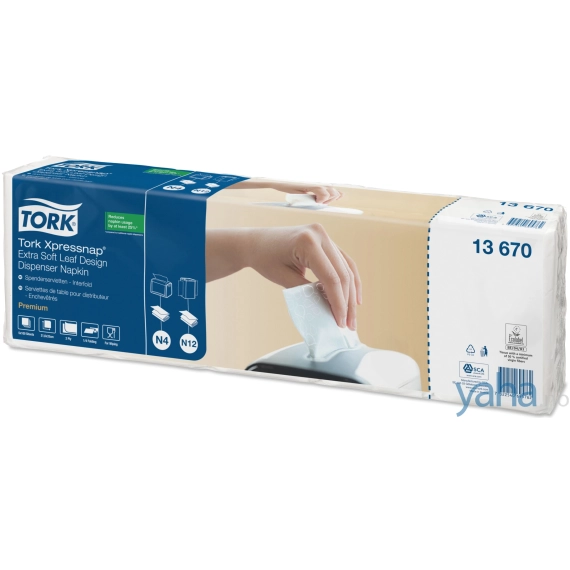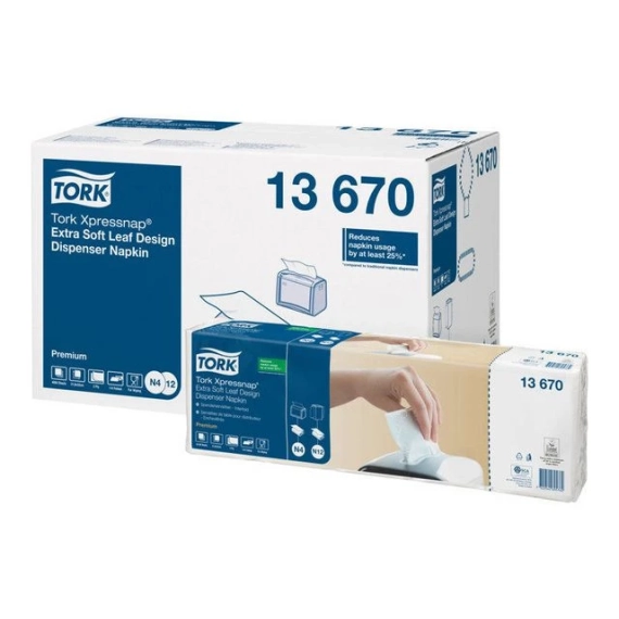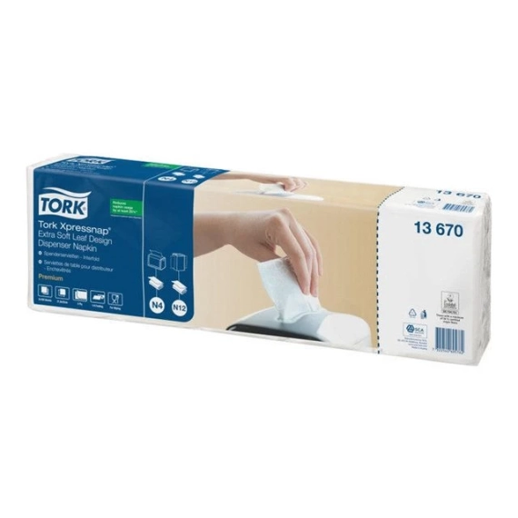 Tork Xpressnap® Ekstra Myk Løvblad Dekor Hvit 2-lags Dispenserservietter er ideelle for serveringssteder med fokus på bekvemmelighet, som ønsker å gi et kvalitetsinntrykk ved å tilby en ekstra tykk serviett med en sofistikert design.