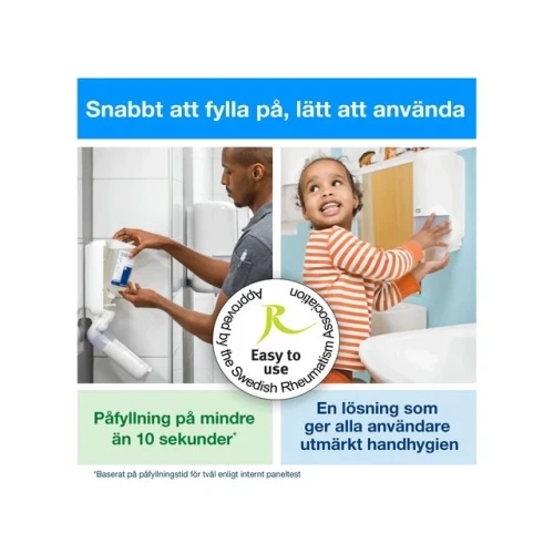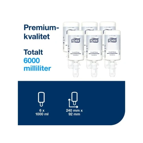 Tork Ekstra Mild Flytende Såpe gir ekstra pleie til tørr og sensitiv hud. Denne såpen er egnet til alle hudtyper, inneholder hudfornyende ingredienser og er ikke tilsatt parfyme. Passer til Tork Håndhygiene Dispenser, som er brukervennlig og sørger for god håndhygiene for alle brukere. Den fabrikkforseglede flasken kommer med en ny pumpe i hver refillpakke, noe som bidrar til å redusere forurensning og holder produktet trygt hele veien til brukeren. - Anbefalt for ekstra skitne hender og når det er behov for kraftig rengjøring, som for eksempel på kjøkken. - Fuktighetsgivende og skånsom mot huden. Inneholder de nærende ingrediensene glyserin, betain og pantenol. - Ikke tilsatt parfyme eller fargestoffer. - Hudvennlig pH-verdi - System S4 - Volum: 1000 ml - Farge: hvit