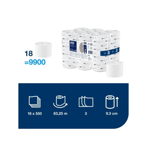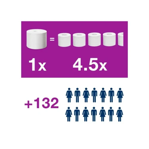 Tork OptiServe® er et hylsefritt toalettpapirsystem med høy kapasitet som passer for bygg der effektivitet, bærekraft og gode gjesteopplevelser er viktig. Mykt, luksuriøst og preget 3-lags toalettpapir med flott design som gir et hjemmekoselig inntrykk. - Tre ganger mer papir enn vanlige ruller for å unngå tomme dispensere - Kompakte ruller – fyll på sjeldnere og spar tid - Ingen hylser eller innpakning betyr mindre avfall - Krever halvparten så mye lagringsplass som konvensjonelle toalettruller - Tork Easy Handling® sikrer ergonomisk håndtering - 3-lags - Materiale: Nyfiber - Rullengde: 63,2m - Antal ark: 550 - Rullbredde: 9,3cm - Diameter: 13,1cm - Farge: Hvit