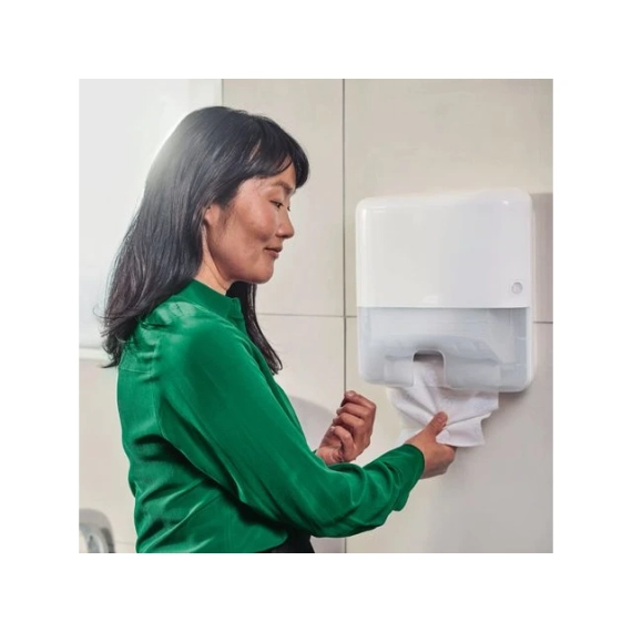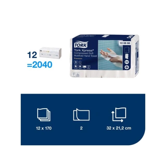 Betjen flere med færre påfyllinger. Bruk mindre tid på å fylle på dispensere - disse håndtørkene er 50% komprimerte, slik at det blir plass til dobbelt så mange i hver dispenser. Gi gjestene en god opplevelse med håndtørk som er både myke og ekstra absorberende. Utmating av ett tørk om gangen bidrar til å forbedre hygienen og redusere sløsing siden gjestene kun berører papiret de tar. H2 kompakte dispensere er svært praktiske og får plass på selv de minste stedene. Kvalitet: Premium System: H2 - Tork Xpress Ubrettet lengde: 32cm Ubrettet bredde: 21,2cm Brettet lengde: 8cm Farge: Hvit 2-lags Godkjent for direkte kontakt med mat Materiale: Nyfiber 170 ark pr bunt/2040 i sekk Sertifisering: EU Ecolabel, FSC