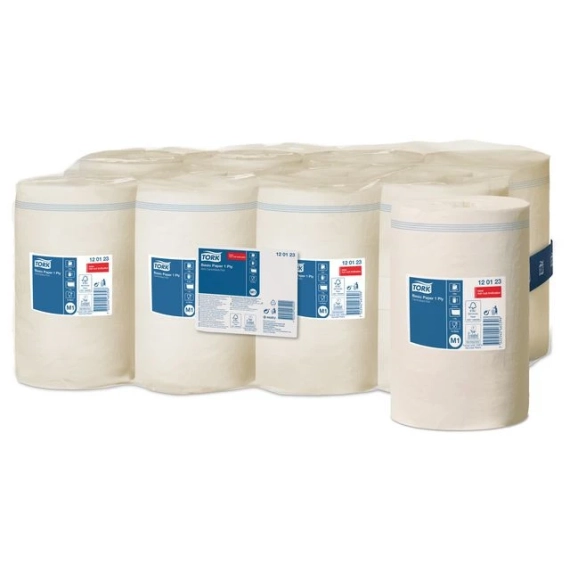 Tork Universal Wiper 310 Mini tørkepapirrull til dispenser består av gjenvunne materialer for å redusere avfall.
