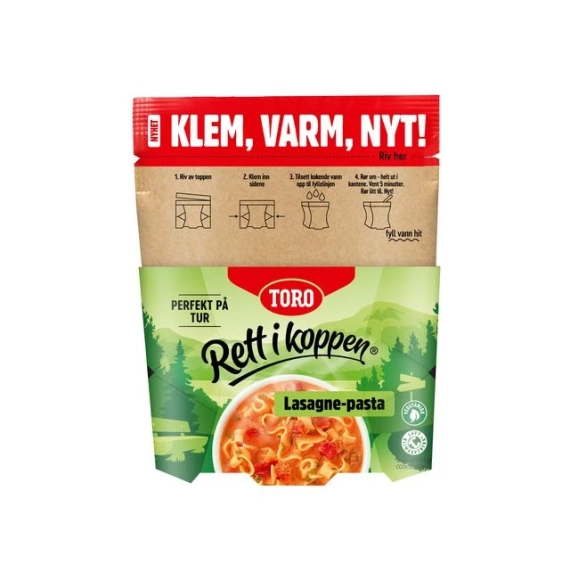TORO Rett i koppen Lasagnepasta gir deg en varmende pause. TORO Rett i koppen Lasagnepasta passer perfekt når man vil ha noe raskt og enkelt, enten det er på arbeidspassen eller på farten. Klem sammen til en kopp, varm og nyt! Enkel tilberedning: Riv av toppen av posen og klem sidene inn. Tilsett kokende vann opp til fyllelinjen. Rør om - helt ut i kantene, og vent 5 minutter. Rør litt til, og måltidet er klart. - Varm smårett til pausen - Allergener: Egg, gluten (Durumhvete), melk og soya - Produktsammensetningen kan endres. Les derfor alltid ingredienslisten på emballasjen til produktet - Vegetarisk rett