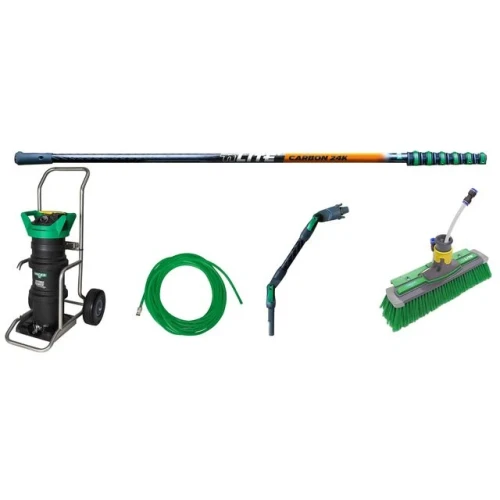Unger Hydro Power Ultra tilbyr en enklere metode for periodisk vask av vinduer og fasader. Renholdet foregår i én operasjon ved at vinduet sprayes med rent vann og skrubbes med børsten. Vann som sprøytes på vinduene kommer i sin reneste form. Vannet går gjennom filtre i Hydro Power Ultra-enheten og kommer ut helt fri for mineraler som kan gi flekker og striper på vinduet. - Dette er et avansert komplett alt-i-en kit med skaft i karbon. Følgende er inkludert: - HydroPower renseenhet Ultra filter størrelse L med tralle - HydroPower renseenhet Ultra filter LC - 1 karbonskaft 24K skaft for renhold opptil 8,6 meter - Vinkel adapter str M, 42 cm - Børste 28 cm - Slange 25 meter - Det er mulig med påbygging av ekstra 3,2 meter med L-CF33G Unger Karbon 24K forlengerskaft.