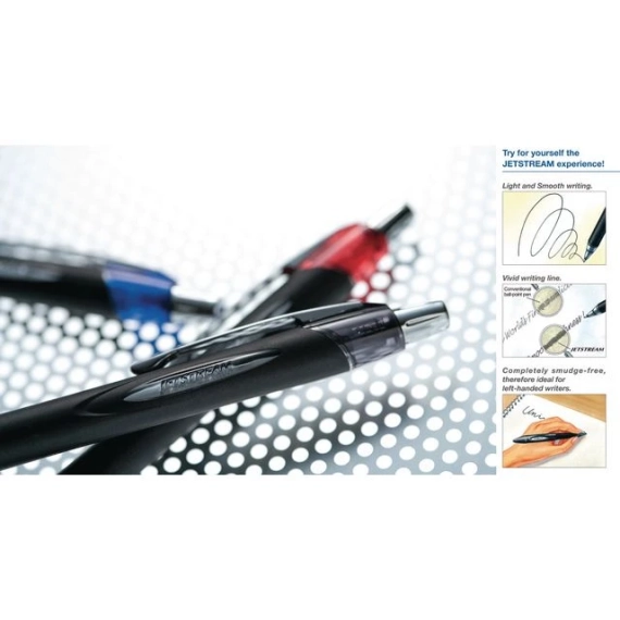 Denne inntrekkbare Uni-Ball-kulepennen har en nyskapende blekkformel som er jevnere og skriver mer konsekvent enn vanlige blekktyper. Pennen gir derfor en meget unik skriveopplevelse. Blekket er hurtigtørkende, vannbestandig og falmer ikke for smittefri skriving. Denne pennen har en lett og komfortabel gummiert kropp med en myk grepsone som passer godt til venstrehendte brukere siden den ikke sklir i hånden. Denne Uni-Ball Jetstream™-kulepennen har en vakker utforming med en lommeklips som gjør den lett å bære, og en middels stor spiss som gir presise, fine linjer.
