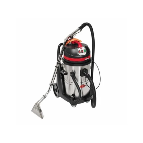 Ypperlig egnet for rengjøring av middels store, teppebelagte områder på kontorer, skoler, restauranter, hoteller og flyplasser. Fantastisk sug med et vacuum på 2.005 mm vannsøyle og en luftstrøm på 3.115 l/min. - Leveres komplett klar til bruk, med både gulvkit, 2,5 m slange og håndsett til rengjøring av f.eks. trekk i biler - Brukervennlig tepperenser, 25 l rentvannstank og 75 l skittenvannstank - 2 motorer på 1.000 W hver - kan startes/stoppes separat - Store bakhjul og roterende forhjul gir enkel manøvrering - Et høyt pumpetrykk sikrer at vannet sprayes jevnt og kraftig på teppet - Rent vannstank og chassis er samlet i én enhet, som gir en meget robust maskin - Du kan enkelt tømme tanken uten å avmontere motortoppen - Beholder til rengjøringsmiddel og chassis integrert som én del, slik at den blir mer robust
