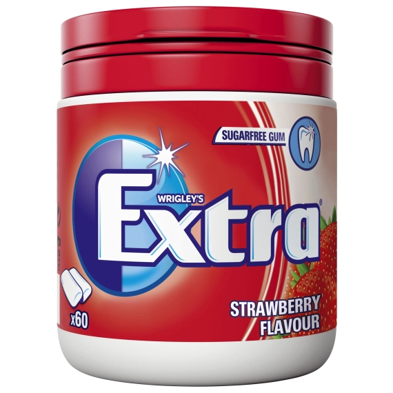Extra Strawberry er en sukkerfri tyggegummi med smak av jordbær som motvirker misfarging på tennene dine.