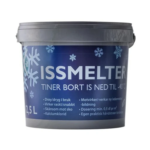 X-it issmelter 12.5L bøtte. Hurtigvirkende kalciumklorid issmelter. Tiner effektivt ned til -40°C. Setter ikke saltmerker. Mer skånsom mot underlaget, vegetasjon, sko og husdyr enn salt. Enkel i bruk: fjern løssnø, strø ut min. 0,5 dl/m² før eller etter frost. La virke minst 30 min, skrap underlaget rent, ta bort smeltevannet. Gjenta behandlingen ved behov. Leveres i praktisk bøtte med strøspade. Drøy i bruk, virker raskt og motvirker ny isdannelse. Skånsom mot sko. TIPS! Effektiv som støvbinder på grusveier, ridebaner, parkerings plasser, og tennisbaner etc. - Dosering min. 0,5 dl pr m². - Fare- og sikkerhetsinformasjon: - H319 Gir alvorlig øyeirritasjon.