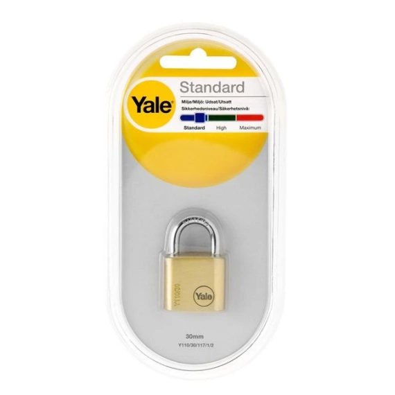 Hengelås 110/30 i messing med bøyle i herdet stål, med Yale sikkerhetsnivå 'Standard' i utsatt miljø. - Selvlåsende stiftsylinder med låsing av begge bøylebein