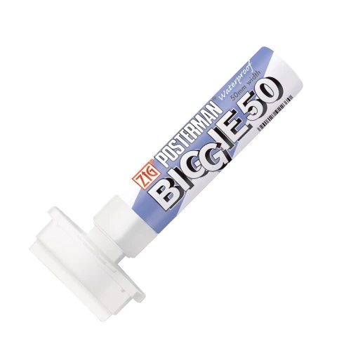 Merkepenn Biggie med 50mm ekstra bred rektangulær spiss. Resultatet ligner på kritt, men uten søl. Teksten blir vannfast når den har tørket, og tekst skrevet med denne tåler å stå utendørs opptil ett år. Perfekt til bruk både ute og inne i butikker, resturanter, puber osv. på de fleste underlag. Denne vannfaste merkepennen har ett meget dekkende blekk som enkelt kan vaskes bort fra ikke-porøse overflater med vanlig vindusvaskemiddel.